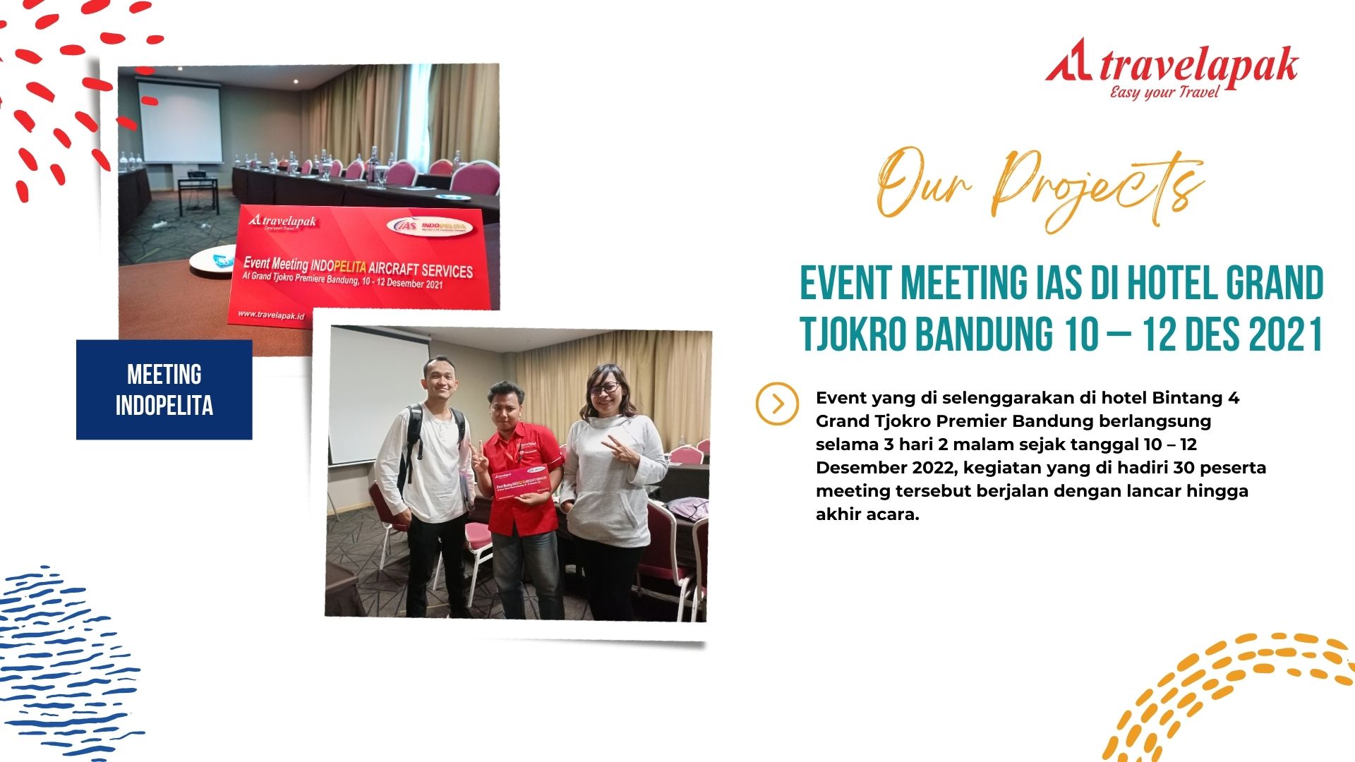 Event yang di selenggarakan di hotel Bintang 4 Grand Tjokro Premier Bandung berlangsung selama 3 hari 2 malam sejak tanggal 10 – 12 Desember 2022, kegiatan yang di hadiri 30 peserta meeting tersebut berjalan dengan lancar hingga akhir acara.