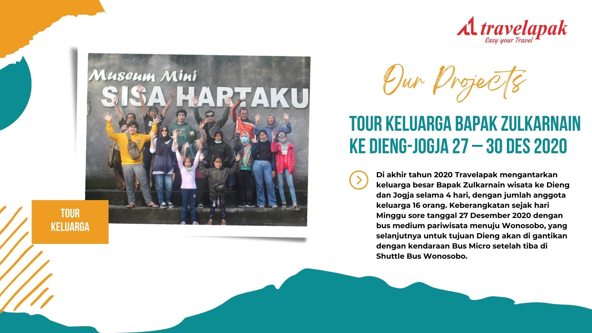 Di akhir tahun 2020 Travelapak mengantarkan keluarga besar Bapak Zulkarnain wisata ke Dieng dan Jogja selama 4 hari, dengan jumlah anggota keluarga 16 orang. Keberangkatan sejak hari Minggu sore tanggal 27 Desember 2020 dengan bus medium pariwisata menuju Wonosobo, yang selanjutnya untuk tujuan Dieng akan di gantikan dengan kendaraan Bus Micro setelah tiba di Shuttle Bus Wonosobo.